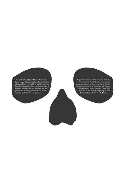 Capitalism reduces forests to junk mail and ecosystems to ash. A rally for the stock market means hurricanes and heat waves for us. Species by species, continent by continent, it is turning the whole world into a graveyard. If we don’t abolish it, it will destroy everything we love. This is a clear-cut case of self-defense.