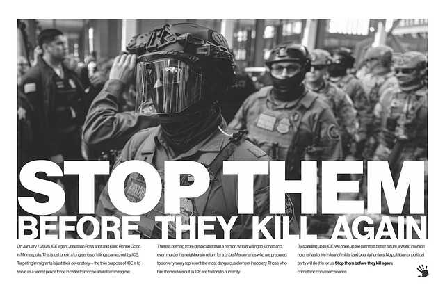 On January 7, 2026, ICE agent Jonathan Ross shot and killed Renee Good in Minneapolis. This is just one in a long series of killings carried out by ICE. Targeting immigrants is just their cover story—the true purpose of ICE is to serve as a secret police force in order to impose a totalitarian regime.